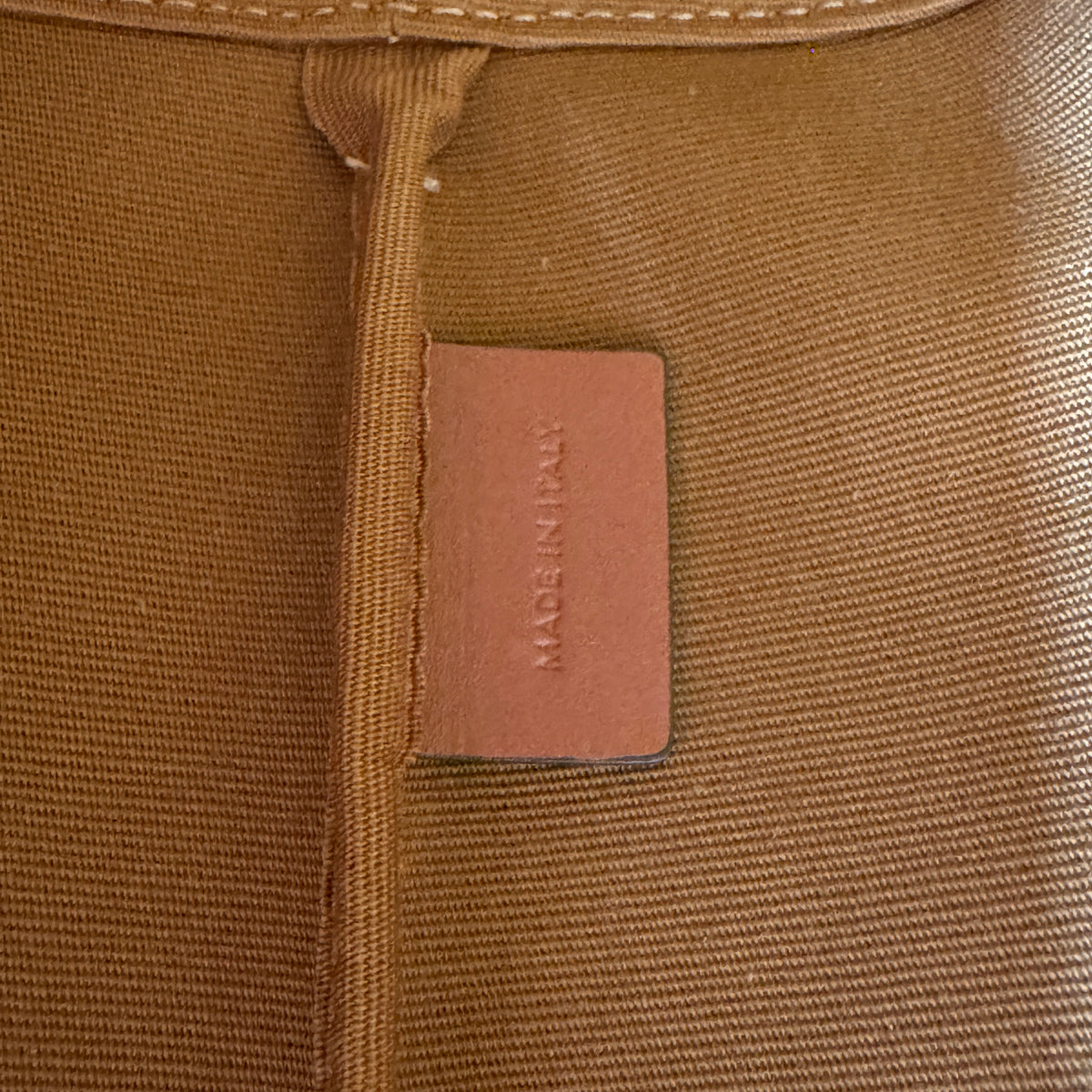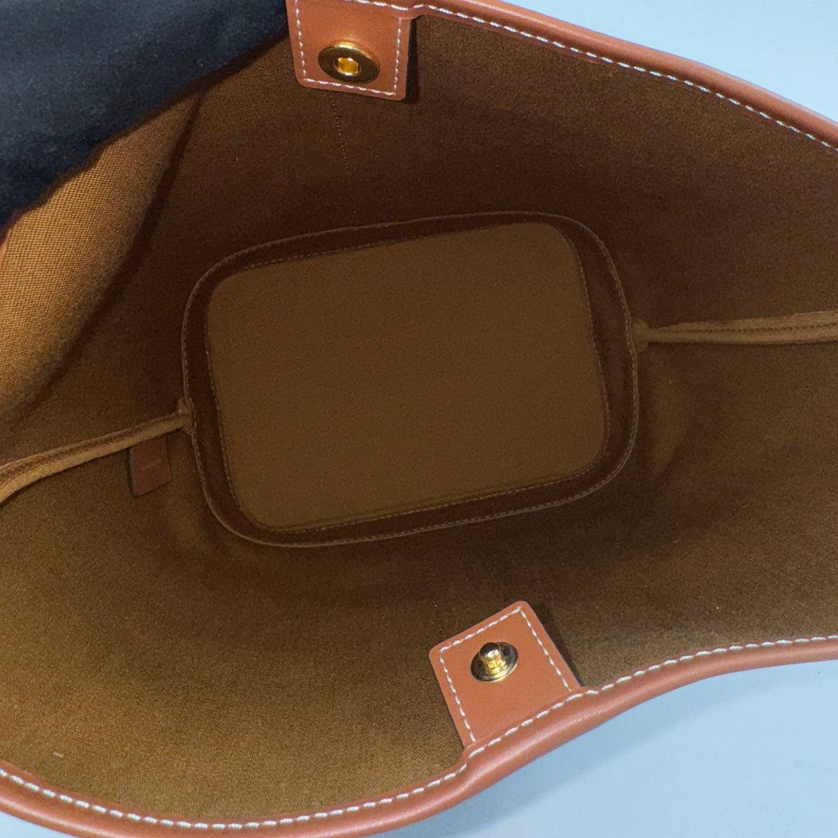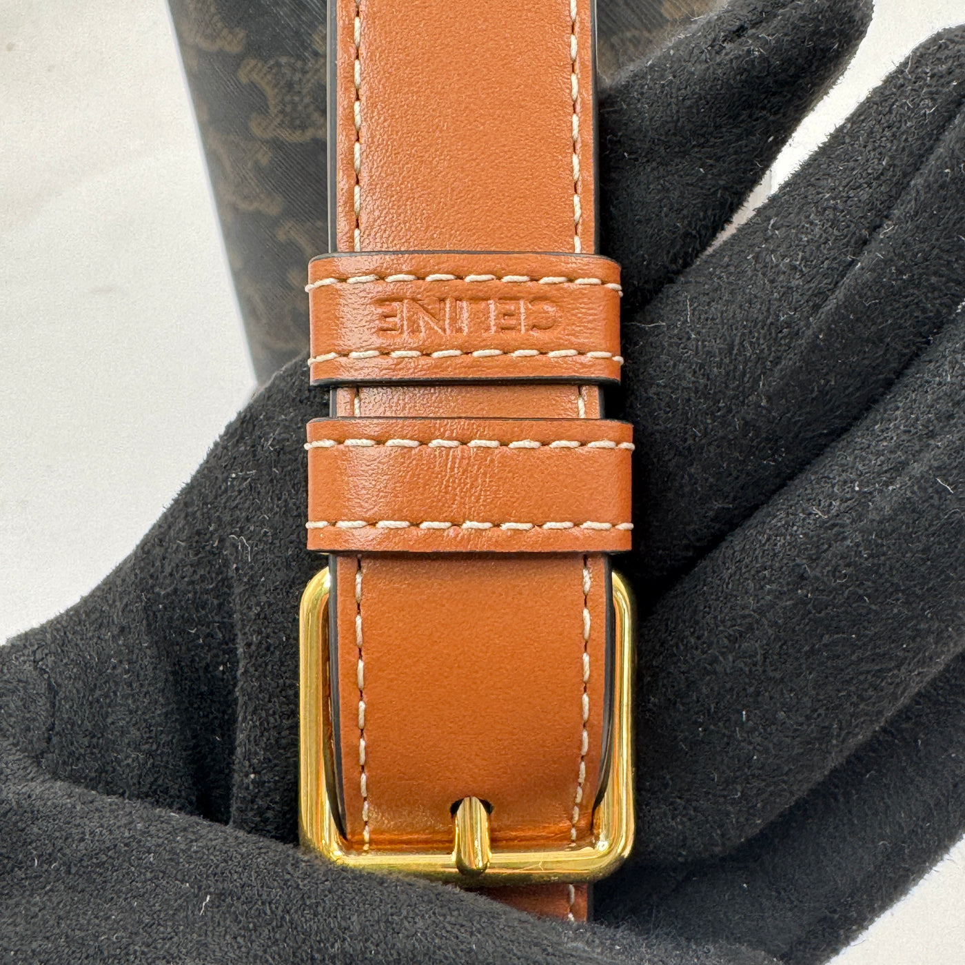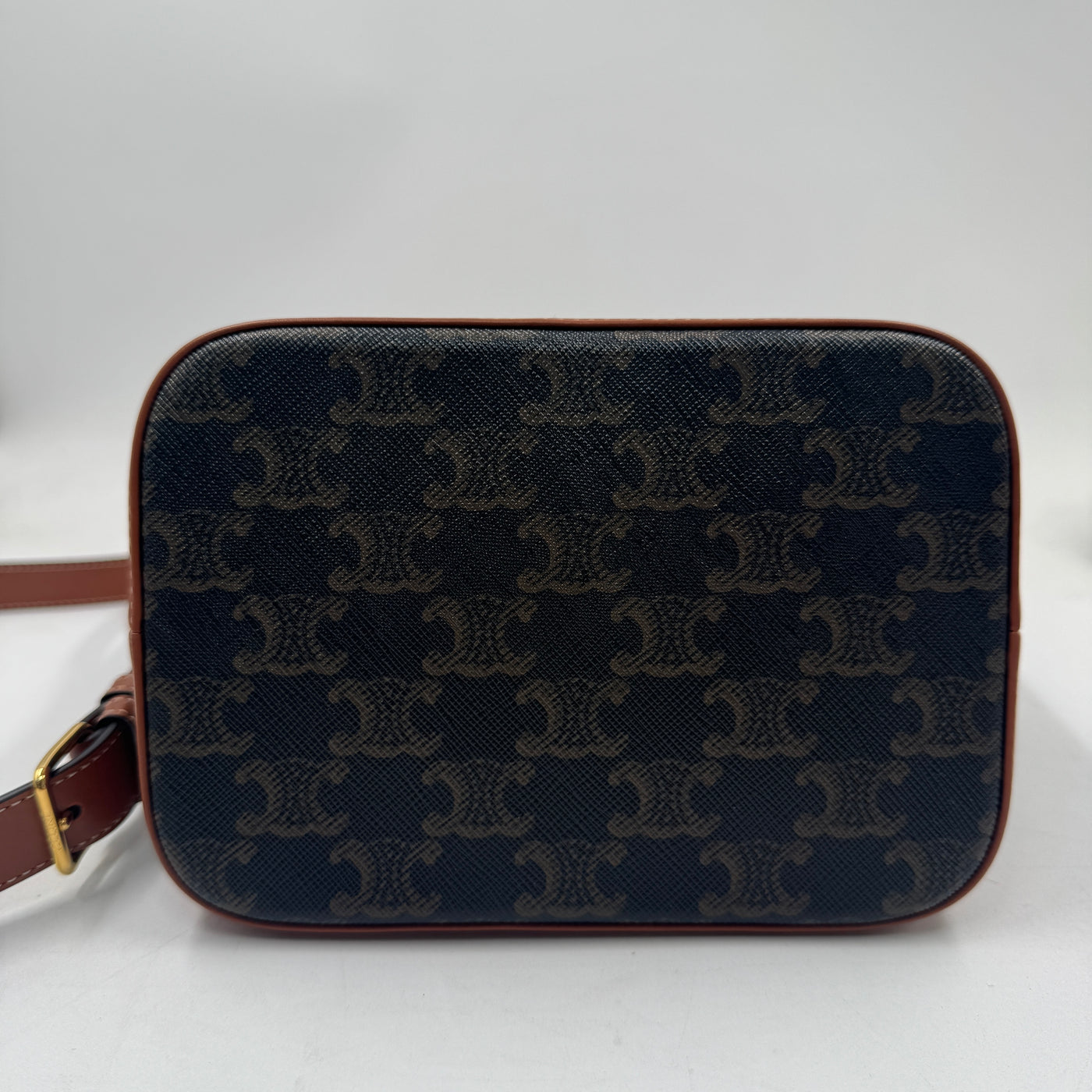 The Celine Triomphe Canvas Calfskin Small Bucket Bag is a chic and sophisticated bag from Celine, known for its minimalist design and luxurious materials. The bag combines canvas and calfskin leather, with the signature Triomphe logo hardware on the front, adding a touch of elegance.